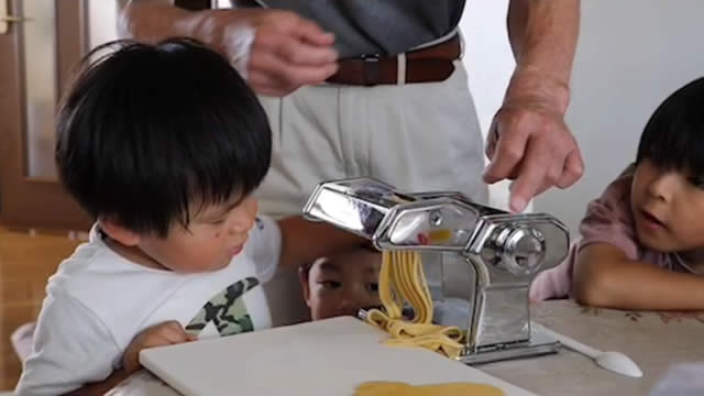 パスタマシーンで餃子の皮を孫といっしょに、楽しく手作り。