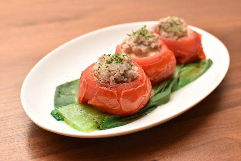 | 3. | トマトの中に挽肉、チーズ、挽肉の順番で詰める。 |
