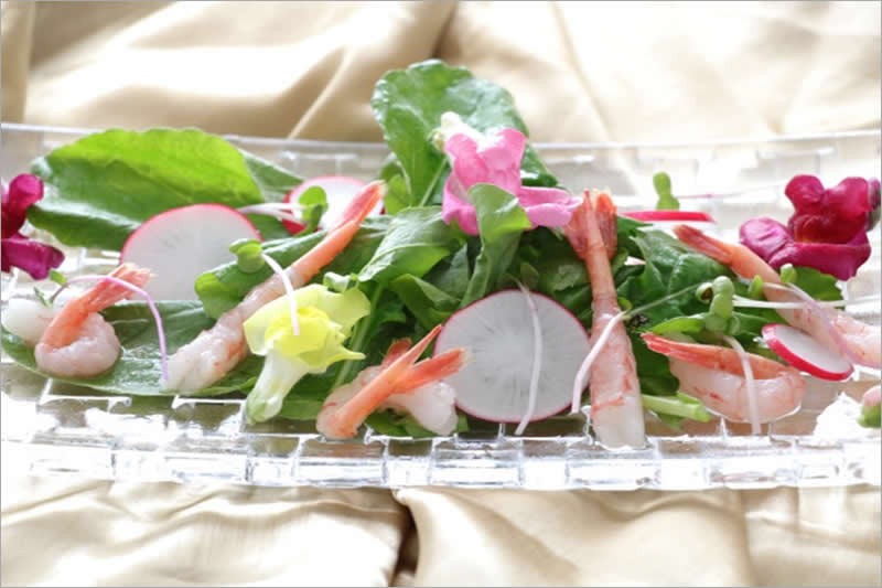 ブロッコリースプラウトは、根元を切り落とす。 ラディッシュは輪切りにする。 器にベビーリーフを盛り、ラディッシュをバランスよく盛り付ける。 甘エビをのせて、ブロッコリースプラウトを散らす。隙間にエディブルフラワーを飾る。 召し上がる直前に<レモンドレッシング>をかける。 |