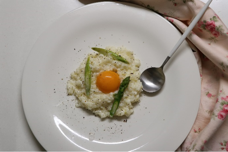 フライパンにサラダ油をひき、玉ネギを弱火で炒める。 玉ネギがしんなりしてきたら、米(無洗米)を加えて、全体が馴染むまで炒める。 熱湯に顆粒コンソメを溶かしたものを加えて中火にし、沸々と煮立ち、米が湯を吸ってきたら(約3分)、牛乳、アスパラを加える。 蓋をせず20分、時々鍋を振って焦げないように(ヘラなどでは混ぜない)、米に少し芯が残るまで加熱する。 |