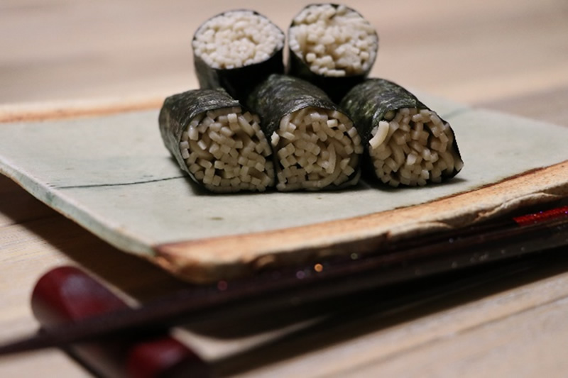 そばの水気を切り、合わせ調味料を和える。 ザルで調味料を切る。 焼き海苔を半分に切り、巻きすにのせる。 奥側を2cm程あけて、そばを並べる。 手前から奥に向かってしっかりと巻く。 ゴムで止めて、巻きすを立てて休ませる。 |