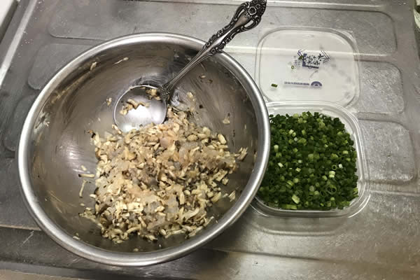 | 1. | ムキエビと椎茸はみじん切りにして混ぜ合わせる。 |