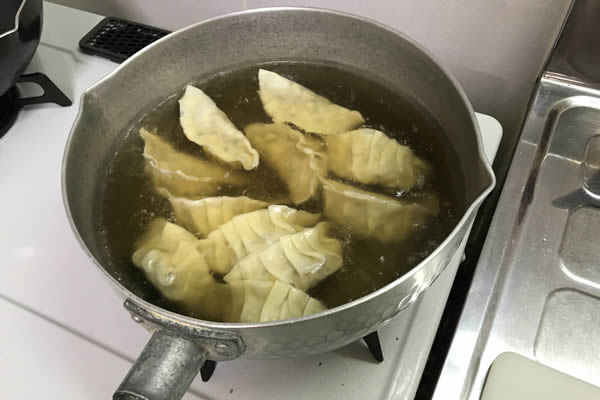 | 7. | その鍋に包んだ餃子を入れ、少し煮込む。 |
