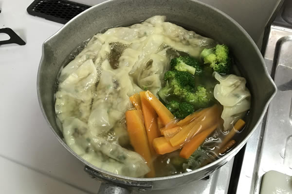 | 8. | 次に、人参を入れ少々煮る。次に玉ねぎと茹でたブロッコリーを入れて、餃子の中身に火が通ったようなら、出来上がり。 |