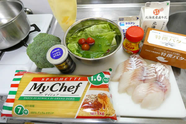 材料はこんな感じ。スーパーで皮なしまだらを見つけ、新鮮そうだったので衝動買いして、さて何を作ろかな。思いついたのが、これ。クリームパスタにすれば美味しいんじゃないかな、と。白身魚でクセもないし、そのぶん味付けは、コンソメと生クリームでこってり。ブロッコリーでちょっとさっぱり。