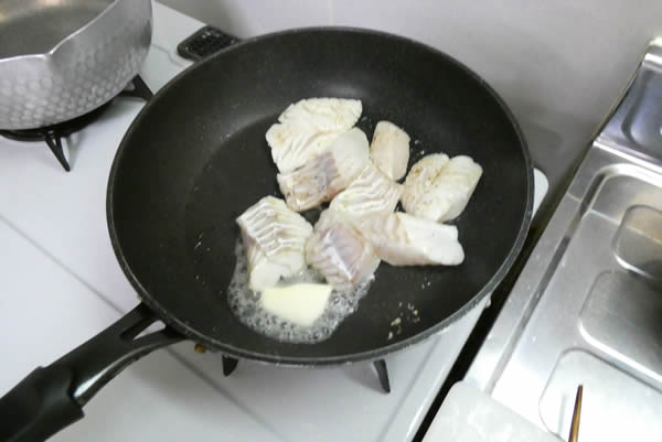 フライパンを熱してバターを溶かして、まだらを焼きます。両面を焼いて火を止めて、ちょっとこのまま。