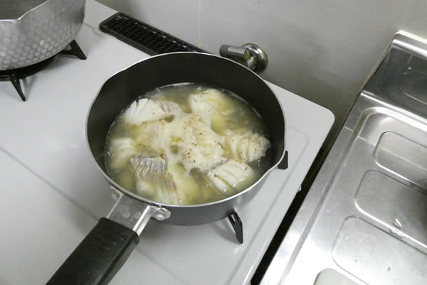 | 4. | 小鍋に湯を沸かし顆粒コンソメを溶かして、塩・胡椒で味付けをしてから、フライパンで焼いたまだらをいれてしばらく煮込む。 |
