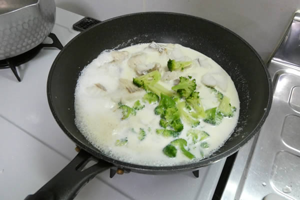 | 5. | 再び、熱したフライパンにバターをひいて、煮込んだまだらと細かく切ったブロッコリーを入れて炒め、牛乳・生クリーム・顆粒コンソメ・マヨネーズを加え、沸騰する前に火を止める。 |