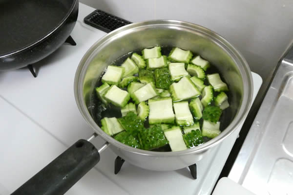 | 1. | ゴーヤは1本を縦半分に切り、スプーンで種をかき出して水洗いして、適当な大きさに角切りする。そして、ある程度の柔らかさになるまで塩茹でする。 |