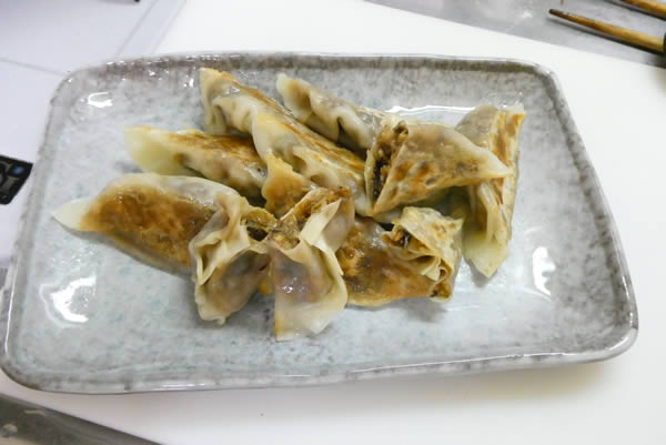 | 2. | 作ったタネを餃子の皮で包み、フライパンにごま油をひいて背の面を焼き、少し焦げ色がついたら水を適量入れて蓋をして強火にする。 |