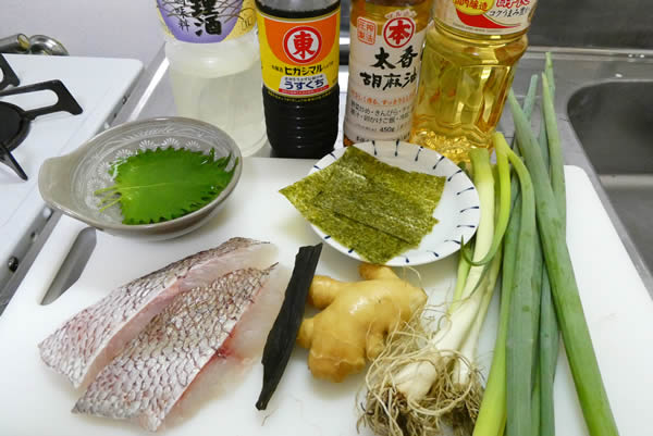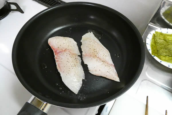 | 1. | 鯛の切り身は中骨を抜き取り、塩・胡椒を振りかけておく。 |