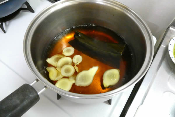 | 2. | 小鍋に水を入れて昆布を浸し、その後生姜の薄切りを入れてしばらくしてから沸騰させ、お酒・みりん・薄口しょう油で味を整える。 |