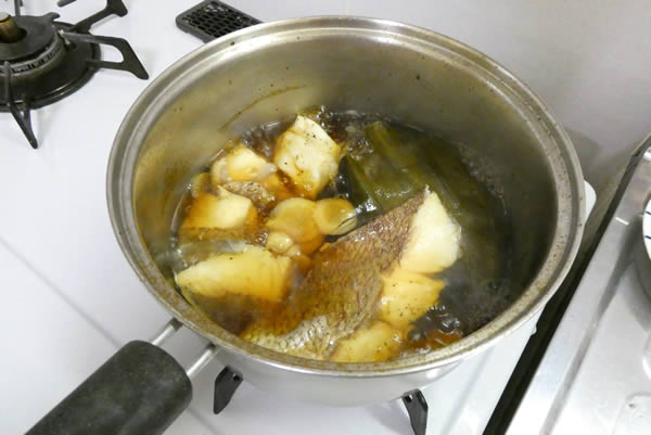 | 3. | フライパンにごま油をひいて鯛の切り身の表面を焼き、フライパンから取り出して適当な大きさに角切りにして、用意した煮汁に入れて煮立たせる。 |