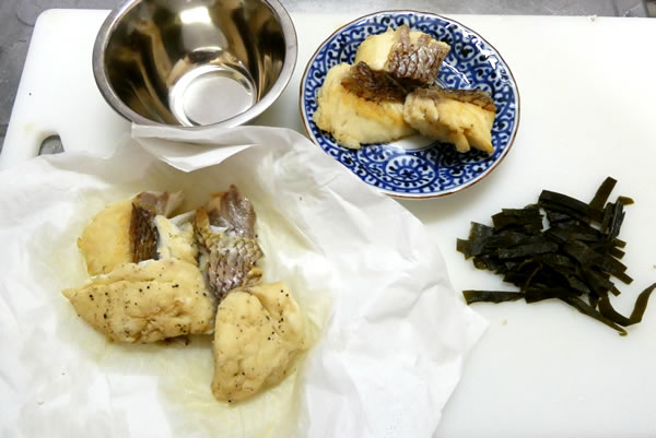 | 4. | 鯛の切り身に火が通り味がしみ込んだところで鍋から取り出して、半分ほどを炒めご飯に混ぜるためにちぎってほぐす。昆布も取り出して細切りにしておく。 |