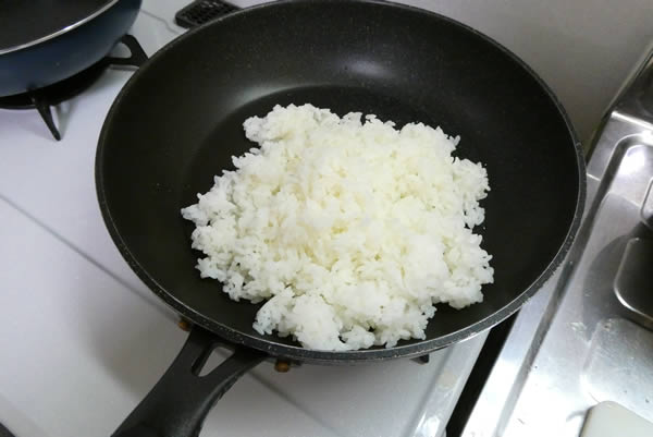 さあ炒めご飯の開始。フライパンにごま油をひいて、まず最初に白いご飯を炒めます。そして軽く塩・胡椒。