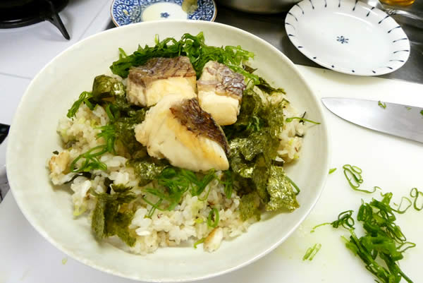 | 6. | フライパンにごま油をひいて、まず最初にご飯を炒め、軽く塩・胡椒を振り、次にほぐした鯛と細切りにした昆布を加えて混ぜ合わせる。次に鯛の煮汁を適量流し入れて混ぜ合わせ、細切り長ネギを追加して、味を整えながら混ぜて、器に盛る。 |