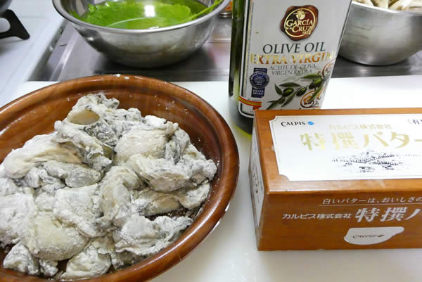 牡蠣に小麦粉をまぶして、オリーブオイルとバターを準備。