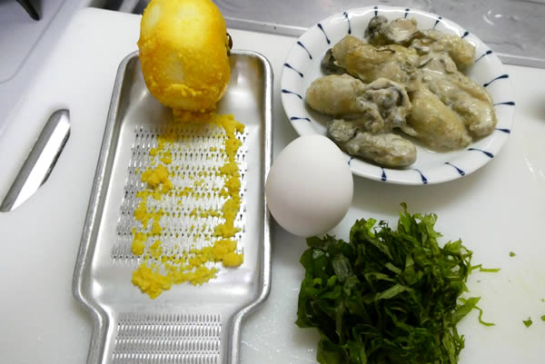 | 1. | 牡蠣は塩水で洗うため、いったん粗塩をかけて混ぜておき、舞茸はサッと水洗い。大葉は水にさらしておく。 |