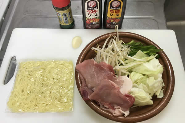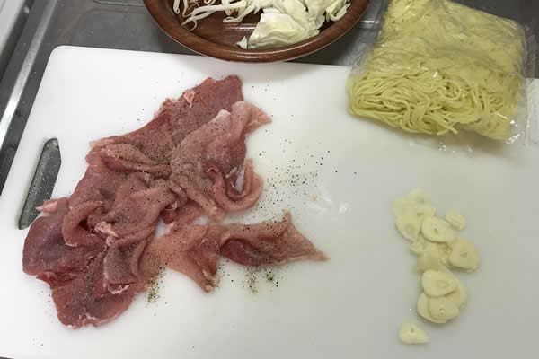 材料はこんな感じ。焼きそばには何といっても豚肉でしょう。野菜は多すぎると、野菜炒めの中にそばが混ざっているような感じになるので、そこそこでいいと思います。人参とかも入れたいけど、麺を味わうがメインなので今回は控えます。