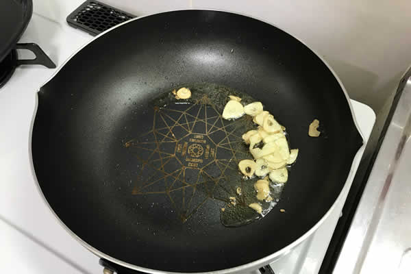 | 4. | フライパンにごま油を入れ、スライスしたにんにくを焦げない程度に炒め、いったん取り出す。 |