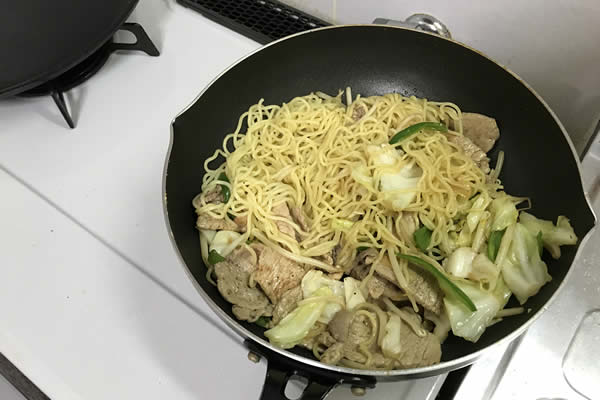 | 7. | 次に焼きそばを入れてほぐす。フライパンが焦げつきそうなら、少量の水を入れる。 |