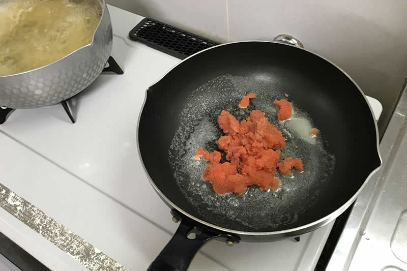 フライパンにバター入れて熱し、ほぐした明太子を入れて木ベラでパラパラにします。明太子がプチプチと怒っているように飛び跳ねるので、牛乳を加え、静かになってもらいます。沸騰しないようにコンロの火加減は中火にします。