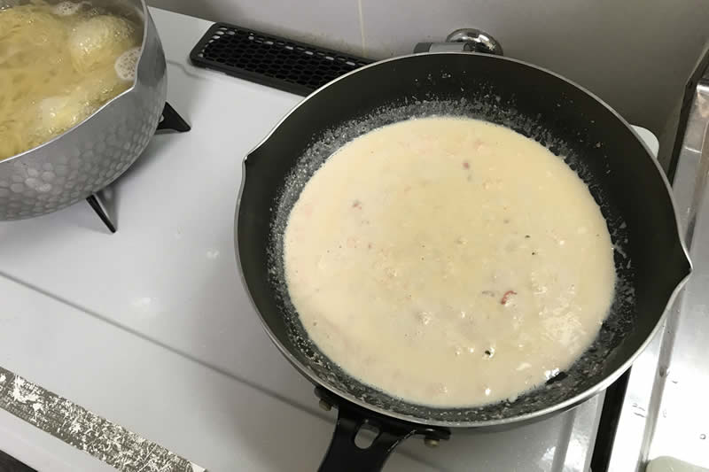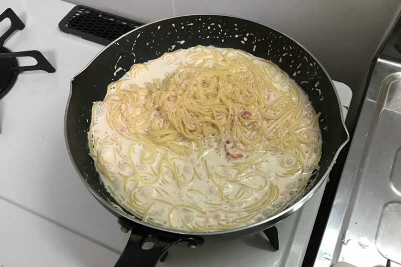 スパゲティが茹であがったら、ザルでお湯を切り、フライパンに麺を入れて再び過熱。フライパンをコックさんのように振りながら、クリームソースを麺にからめます。ちょっと味見して、塩味が薄かったら、茹で汁の残りを足す。味が濃かったら、水かお湯を足すしかないかな。