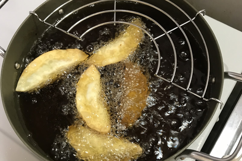 2.熱した油にポテ餃子を次々に入れて、皮がいい具合に色づいたら取り出しす。