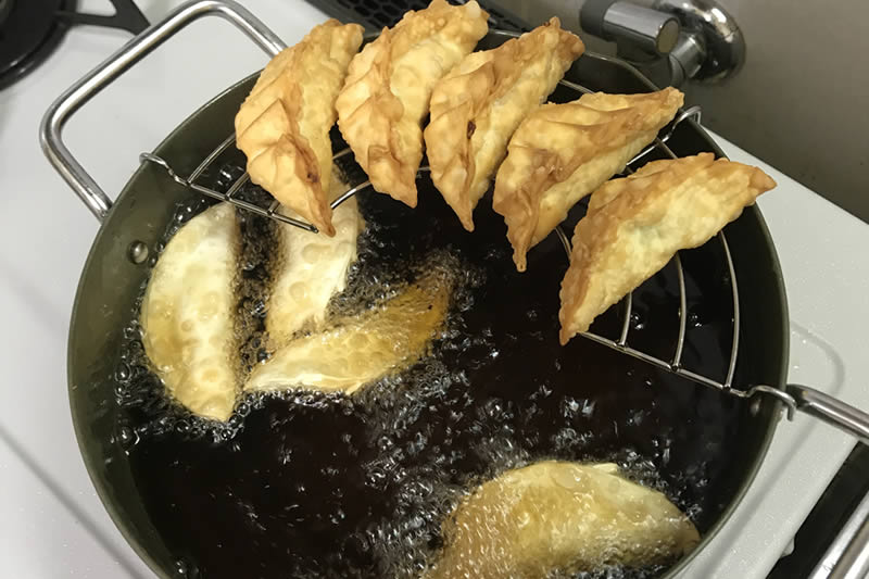 | 2. | 熱した油にポテ餃子を次々に入れて、皮がいい具合に色づいたら取り出しす。 |