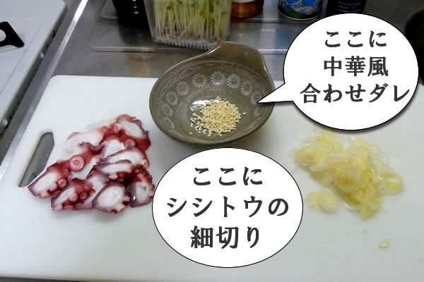 たこは適当な大きさにぶつ切りします。長ネギは最後に入れますが、薄切りしておきます。中華風スープのタレを作るため、小皿に顆粒の鶏ガラスープを入れてお湯で溶かします。