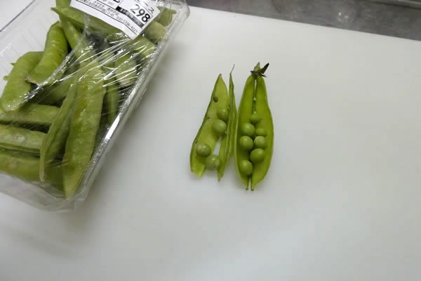 | 1. | グリーンピースはさやから取り出し、塩ゆでにする。 |