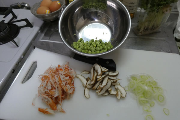 ほぼカニは指でちぎってばらけさせます。しいたけと長ネギは薄切りにします。そして、さやから取り出したグリーンピース。手を使う作業はこれでOKかな。
