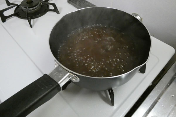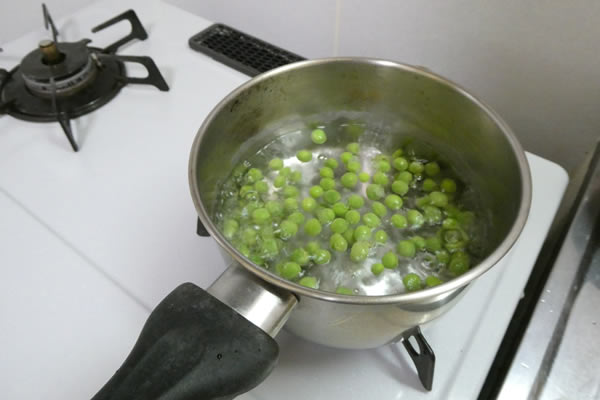 鍋に湯をわかし、グリーンピースを塩茹でします。生のまま使用することも考えたのですが、食べて硬かったり、青臭いと後悔するので、塩茹でです。