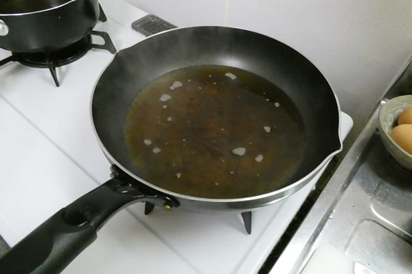 いよいよ本編に入ります。フライパンにコップ一杯ほどの水を入れて沸騰させます。またも顆粒鶏ガラスープの出番。適量入れ、溶けたところで、お酒・みりん・薄口しょう油で味付けします。しょう油が薄口なのは、好きだからです。それに色具合が上品で、見た目もさっぱりしていそう。