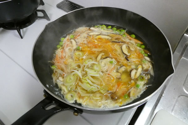 | 5. | フライパンに水をコップ一杯分ほど入れ、沸騰させてから、顆粒の鶏ガラスープを入れ、お酒、みりん、薄口しょう油で味を決めて、ほぼカニ、しいたけ、茹でたグリーンピースを加え軽く混ぜる。 |