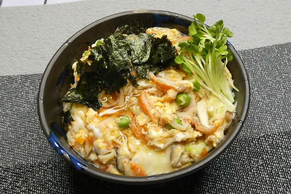 | 7. | 器にライスを盛り、その上にフライパンの玉子とじをかけて出来上がり。 |