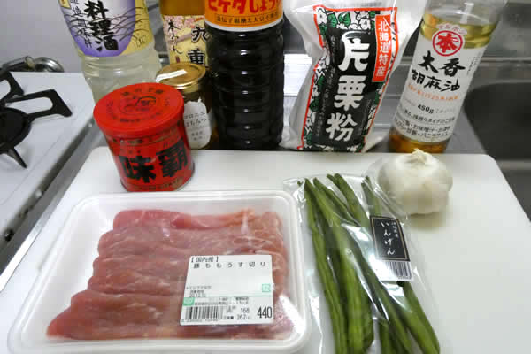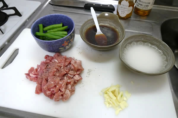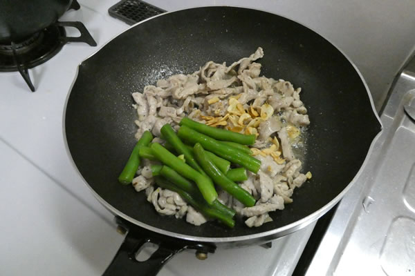 | 7. | 豚肉に火が通ったら、いったん取り出したニンニクと茹でたインゲンを加え、サッと炒める。 |
