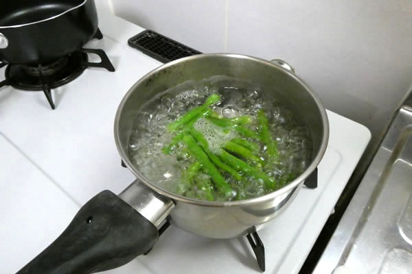| 1. | インゲンは適当な長さに切り、少し固めに塩茹でにする。 |
