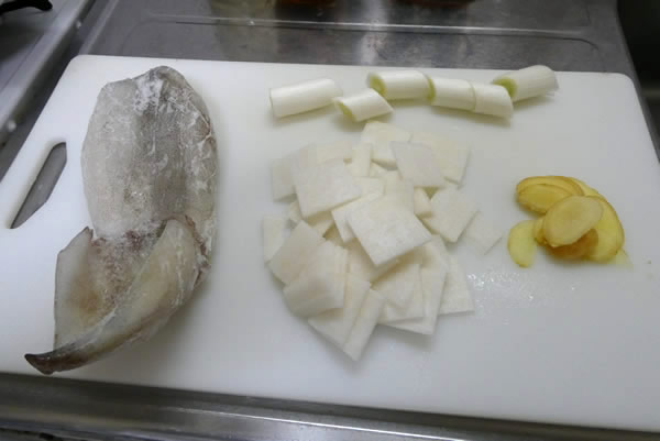 だし汁を作っている間に、長ネギを小口切り、大根は短冊切り、生姜を薄切りにします。スルメイカは冷凍してあったので、水洗いして溶かし、柔らかくしておきます。