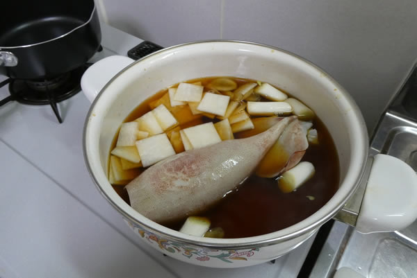 | 2. | その鍋に、スルメイカ(一杯まるごと)とスライスした生姜、薄切りにした大根、小口切りにした長ネギを入れる。 |