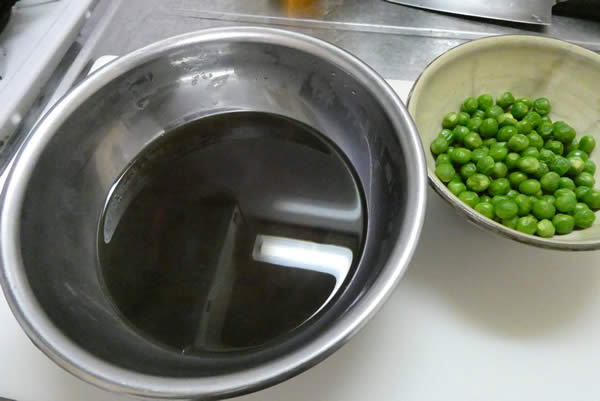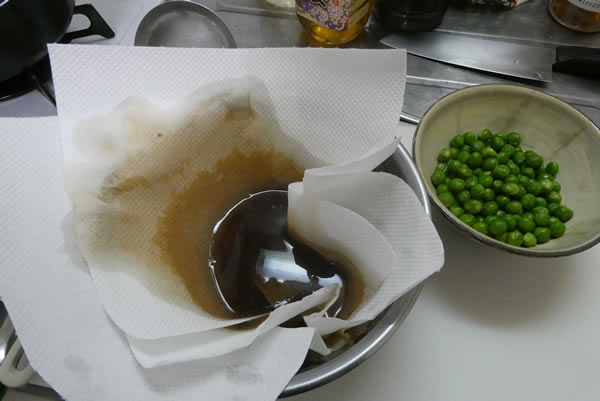 グリーンピースを茹で終えました。イカを煮込んでいた煮汁は、炒めご飯の味付けに使うので、煮汁を濾さなければいけないのですが、濾し器がない。ここはキッチンペーパーで何とかしようと、ボウルにキッチンペーパーを3枚しいて、濾してみました。