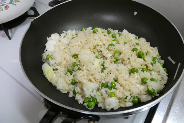 | 6. | フライパンにゴマ油をひき、グリーンピースを入れてサッと混ぜ、すぐにご飯を加え、炒める。 |