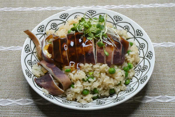 グリーンピースを茹でている間に、煮込んでいる丸ごとイカを半身に分けます。そのほうが火の通りもよくなり、味も染み込みやすくなると思いましたが、半身のイカの片方が丸まってしまい、困った困った。まあ、尾のある方だけご飯の上に乗せるので、良しとします。
