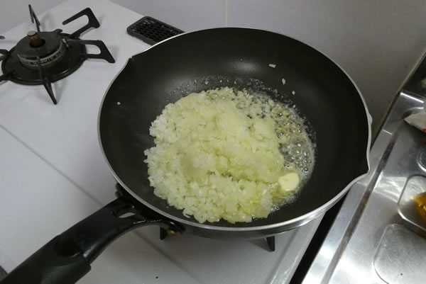 フライパンを熱しバターを溶かして、みじん切りした玉ねぎを炒めます。玉ねぎの色がキツネ色になったら、火を止めて冷ましておきます。別の器にあけて冷まそうかと思いましたが、時間があるので、そのままにしておきます。冬は寒い。