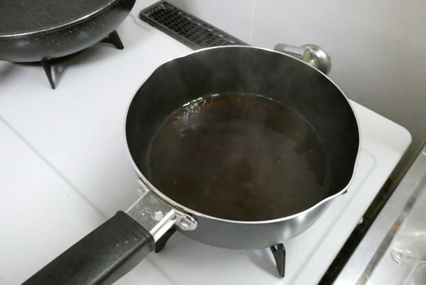 玉ねぎを冷ましている間に、肉詰めしいたけの上からかけるタレを作ります。手鍋に湯を沸かし、顆粒コンソメを適当な分量入れて溶かし、次にお酒・みりん・濃口しょう油を加え、味見します。かけた時に丁度よい味になるように想像して、水溶き片栗粉でとろみをつけます。