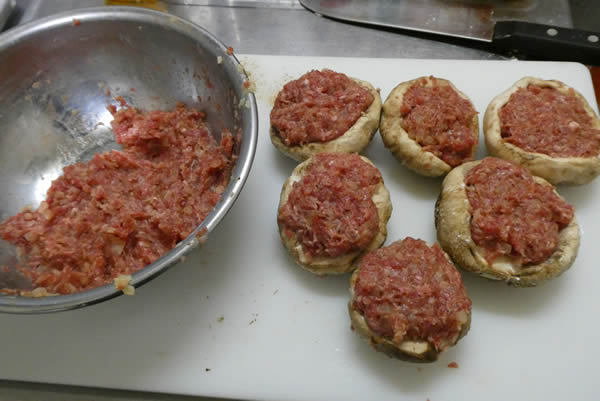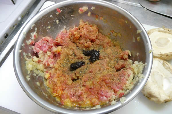 | 4. | しいたけの柱を切り除き、裏の部分に小麦粉を塗り、挽き肉の材料を詰める。 |