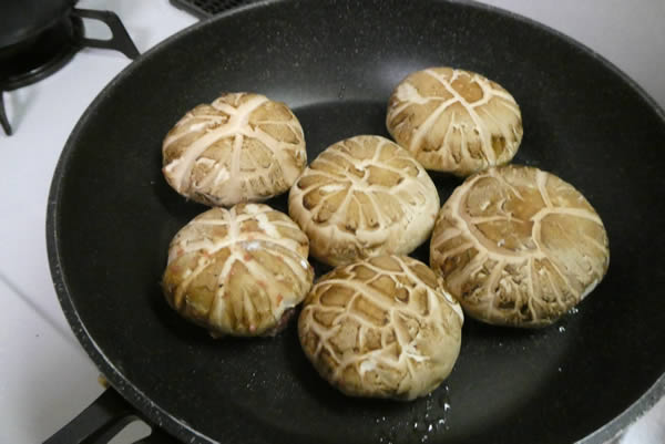 | 6. | フライパンにバターをひき、肉詰めしたシイタケを肉の部分を下にして、並べるように置く。そして鍋蓋をして蒸し焼きにする。 |