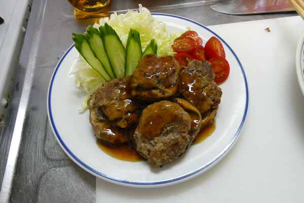 肉をしいたけに押し付け、いかにも肉詰めのまま焼いたように見えるようにして、上からとろみのタレをかけて出来上がり。