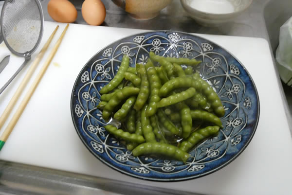 | 5. | 砂糖ざやがある程度煮えたら、砂糖ざやを取り出しお皿に盛り付ける。 |