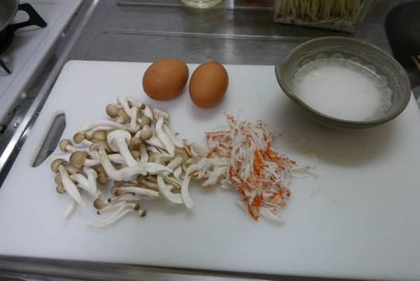煮ている間に、砂糖ざやの上からかける、卵とじあんかけの準備です。しめじとカニかまをばらしておきます。片栗粉は水で溶いて小皿に準備OK。